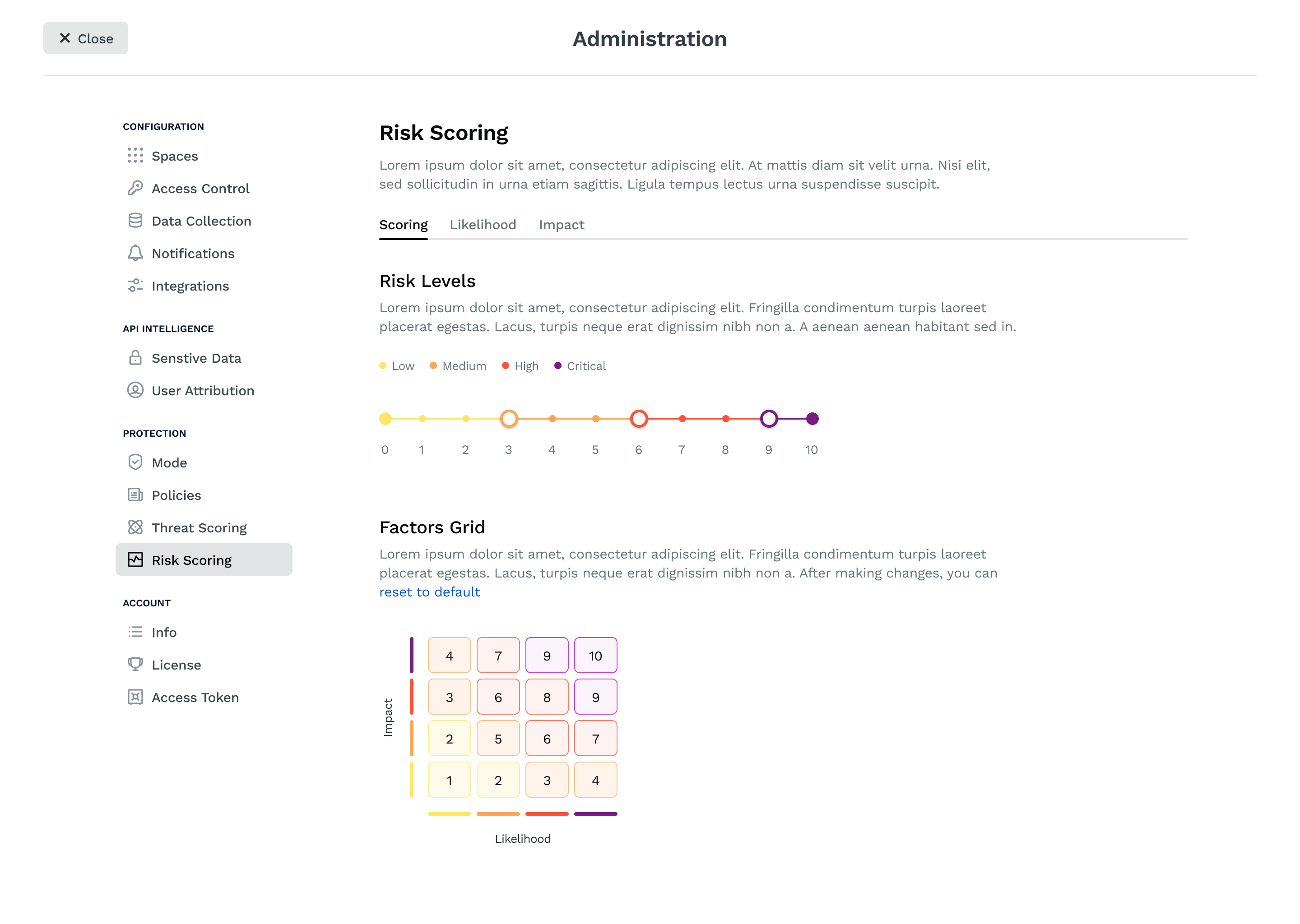 We used a set of parameters to calculate risk scores for any APIs. Based on the likelihood of an attack from a bad actor, and the impact of any possible threat, we assessed a risk score. In addition, agents were allowed to customize their risk levels and the criticality of any metric that contributed to their score.